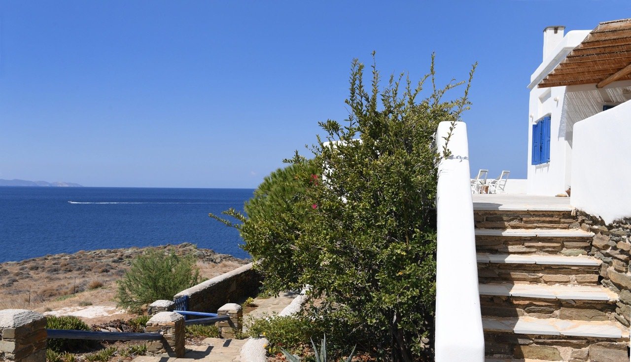 A near-private beach lies just steps away, while expansive outdoor spaces offer uninterrupted views across the sea toward nearby islands, including Syros and Gyaros. Evenings open into wide horizons and soft light, with the house positioned for remarkable sunset views.